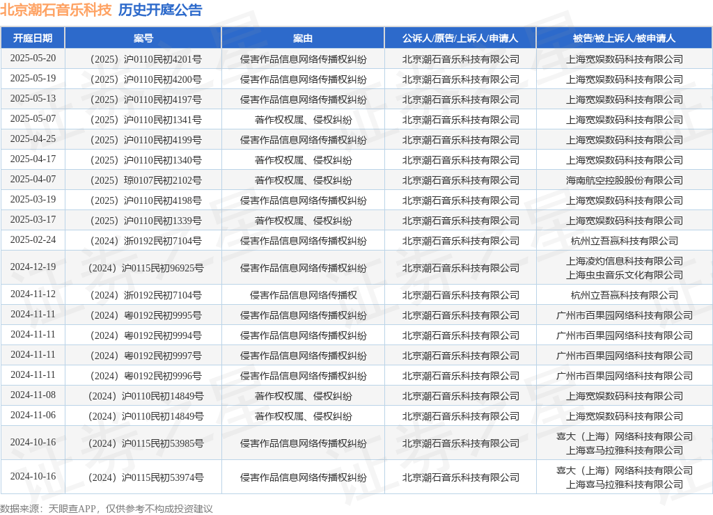 本站消息,根据天眼查APP显示,近日公布了一则北京潮石音乐科技有限公司作为原告/上诉人的开庭公告,详细内容如下: